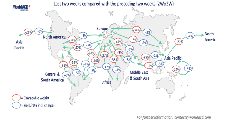 Worldwide rates are currently -28% below their unusually elevated levels this time last year at an average of US$3.08 per kilo in week 1, despite the effects of higher fuel surcharges, but they remain significantly above pre-Covid levels.